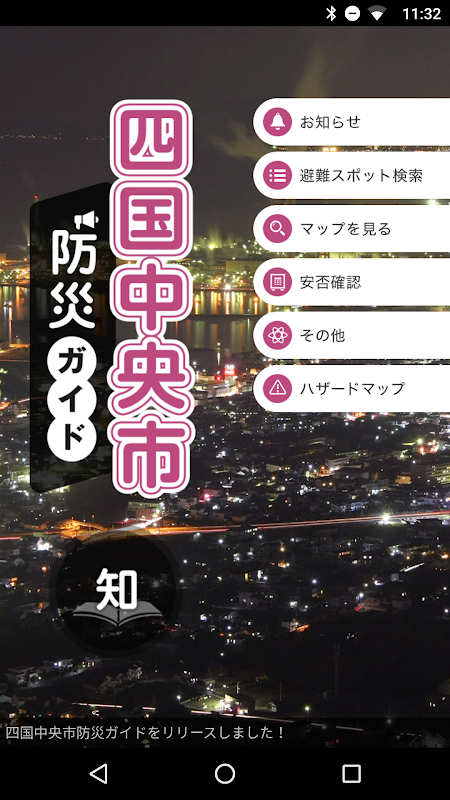 愛媛県四国中央市における自然災害の有事に備えて、あらかじめ避難所やハザードマップを確認できるよう、防災意識を向上していただくための防災ガイドアプリです。