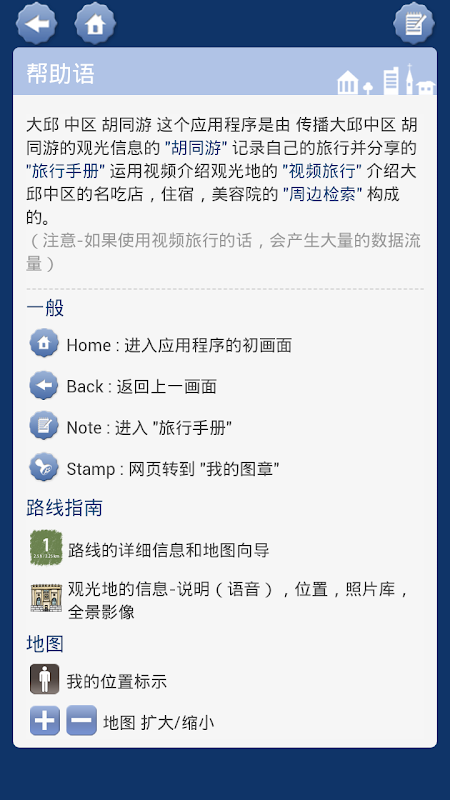 此应用程序详细介绍了大邱中区近代胡同游5个旅游线路和主题旅游线路,并提供无导游自行寻路功能、周边信息查询功能、可以写游记的旅行手册功能等多个功能。
