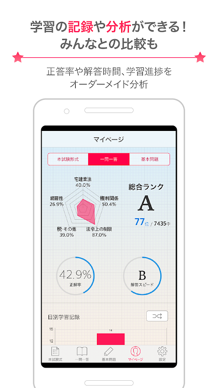 ・問題ごとの、自己の勉強記録、平均正解率、平均解答時間確認