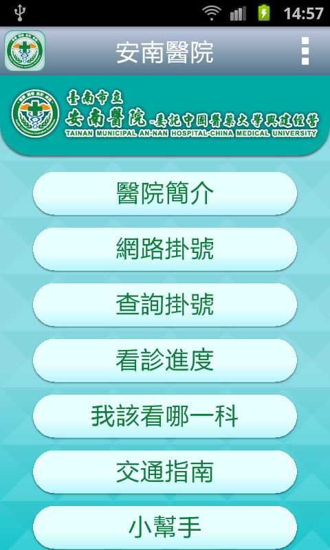 安南醫院行動掛號系統包含醫院簡介、網路掛號、查詢掛號、看診進度查詢、交通指南、我該看那一科、掛號語音小幫手等功能。