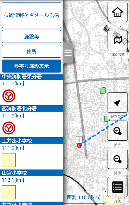 ・ Desde la posición actual (cuando se usa GPS) hasta la instalación seleccionada como objetivo, conéctese con una línea junto con la pantalla y la guía de distancia.