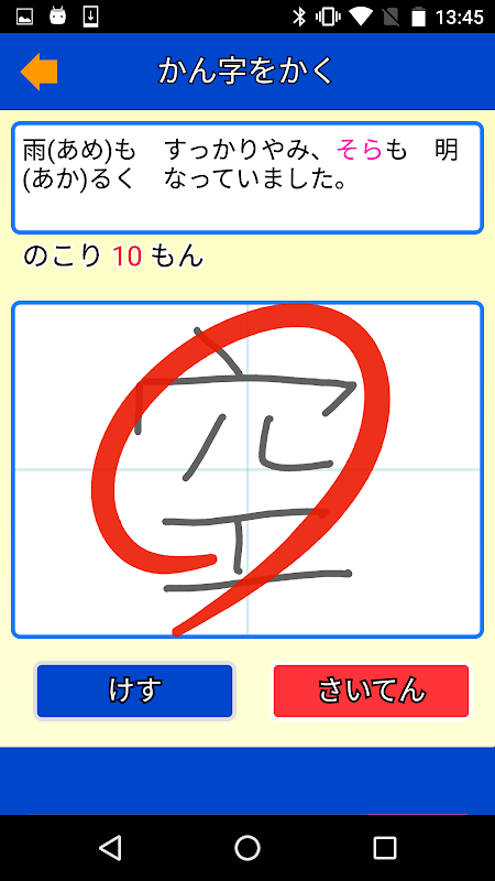 ・「かん字をかく」では回答を画面に指で漢字を書くと自動で認識されます。