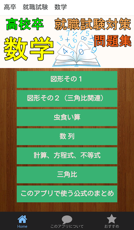 高校生向けの就職、入社試験 数学の一般常識テストに対応した無料のアプリです。筆記試験の対策用として、SPI以外のテスト問題を中心に構成してあります。