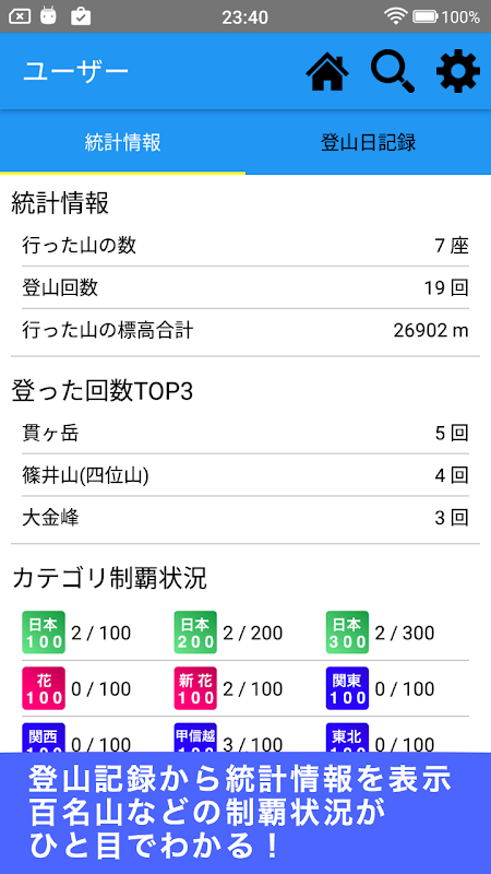 日本百名山のカテゴリごとの登頂数も記録として参照できます。