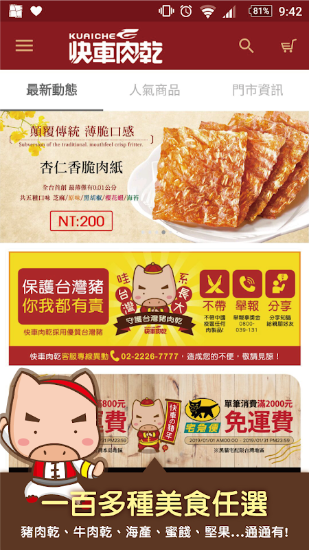 快車肉乾30多年的熟悉滋味,提供APP隨時線上購物服務,安全線上刷卡、全省宅配到府。