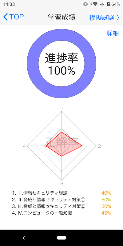 学習および模擬試験の結果は成績画面でカテゴリ毎の正解率をレーダーチャートおよび履歴で確認することができます。