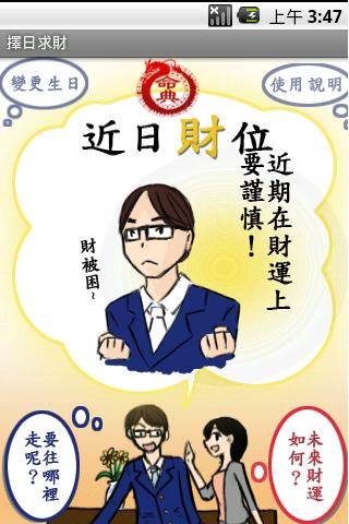 想要知道自己今日的財方在哪裡嗎?對於未來的財運感到好奇嗎?本程式提供你好的財運方向以及近幾日的好日子,讓你出門尋找好財方,選擇好日子做投資,拼業績。