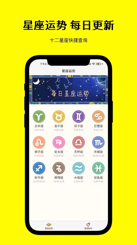 十二星座运势每天更新。可以帮助你了解每个星座的每日、每周、每月、每年的运势变化。了解12星座的爱情配对,事业发展,财富变化,学业前景,健康状况,更好地掌握自己和他人的星座运势和性格。