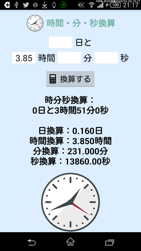 入力された時間を「日時分秒表示」「日表示」「時間表示」「分表示」「秒表示」にそれぞれ換算します。