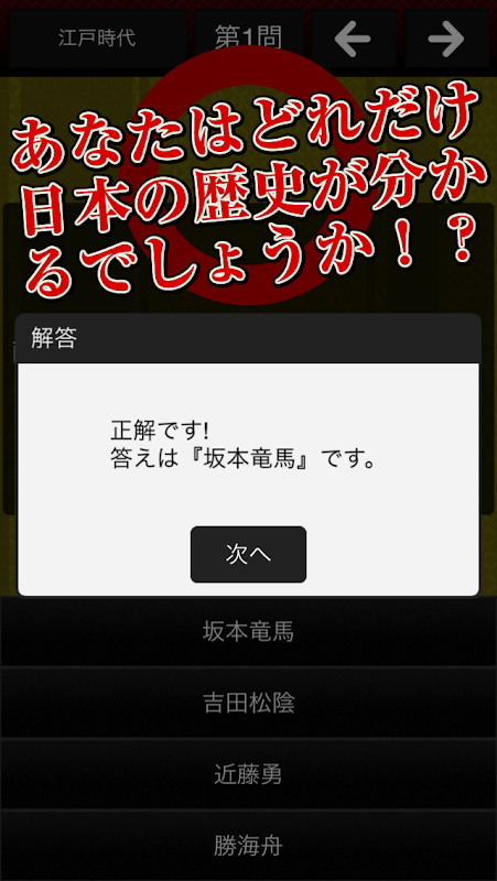 『暇つぶし日本史クイズ』は日本史を簡単に勉強できるクイズアプリです。四つの選択肢から回答を選びます。問題は300以上の中から時代別に出題されます!!