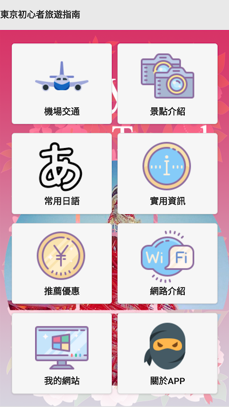 這是東京初心者旅遊指南,提供東京景點交通介紹(景點介紹有GPS可以協助導覽)、常用日語(點擊發音播送)、實用資訊(裡面有匯率計算、熱門商品、常買藥物、路線查詢、天氣查詢等介紹)、推薦優惠與免費無線網路介紹。
