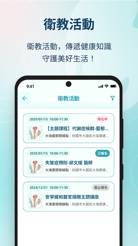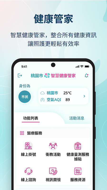 La aplicación Taoyuan City Smart Health Manager brinda servicios integrales de gestión de la salud al público, instituciones médicas y oficinas de salud. Entre sus funciones se encuentran la videoatención, la medición de la salud, la consulta online y actividades de educación sanitaria, etc., para promover una vida saludable.
