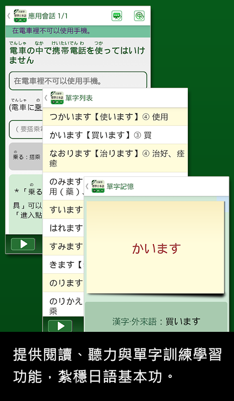 1. Entrenamiento de lectura: pantalla en chino y japonés o modo oculto, puede configurar el entorno de aprendizaje de comparación japonés / chino y japonés completo