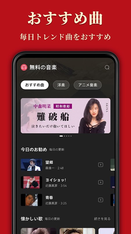 Recomendamos nuevas canciones que son populares todos los días. Incluye JPOP, KPOP, japonés, occidental, enka, música anime, rock y música ligera.