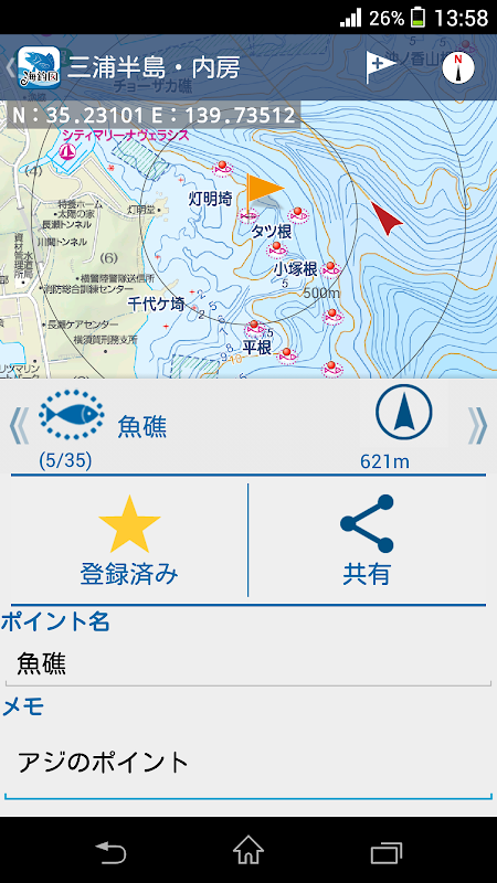 La buena pesca "fish reef" y "root" se registran fácilmente en My Point. Puede registrar fácilmente sus propios puntos de pesca que no están en el mapa y compartirlos con sus compañeros de pesca (compartidos por correo electrónico).