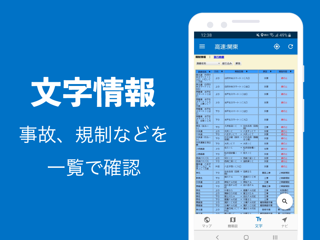 ●文字表示は事故・災害・工事など規制情報と、通過予測時間を確認