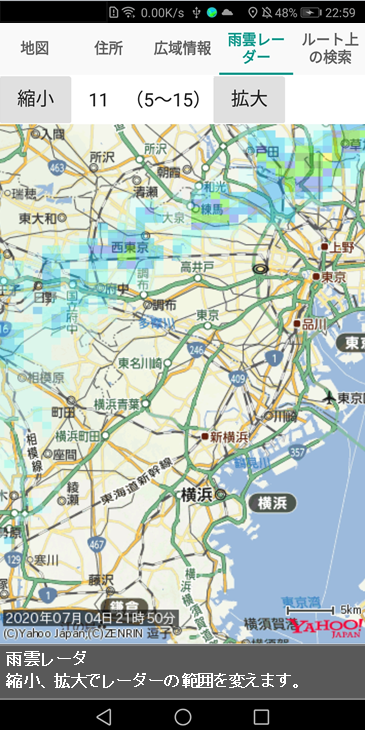 4.雨雲レーダーは、最新の雨雲の発生状況を表示します。レーダーの縮尺は5~15で、5が広域で日本全土、15が狭域で近所になります。[+]は現在位置です。