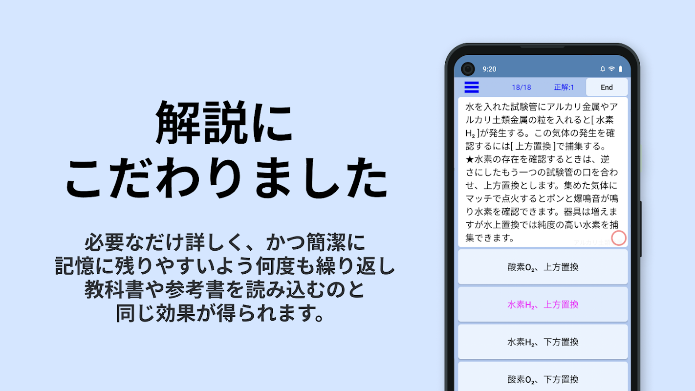 Resolveremos cada pregunta con un límite de tiempo de 20 segundos, y finalmente nos responderemos entre todos. Seleccione una vez para cada pregunta, y las respuestas correctas e incorrectas se mostrarán al final de 15 preguntas o cuando termine a la mitad con el botón Finalizar. Las calificaciones se puntúan y la transición de la puntuación se convierte en un gráfico y se puede ver visualmente. En la Prueba 15, el rango de preguntas se reducirá, por lo que podrá obtener un puntaje alto en un período de tiempo relativamente corto al hacerlo. Se adopta un mecanismo cercano a la curva de olvido para el intervalo de preguntas y el orden.