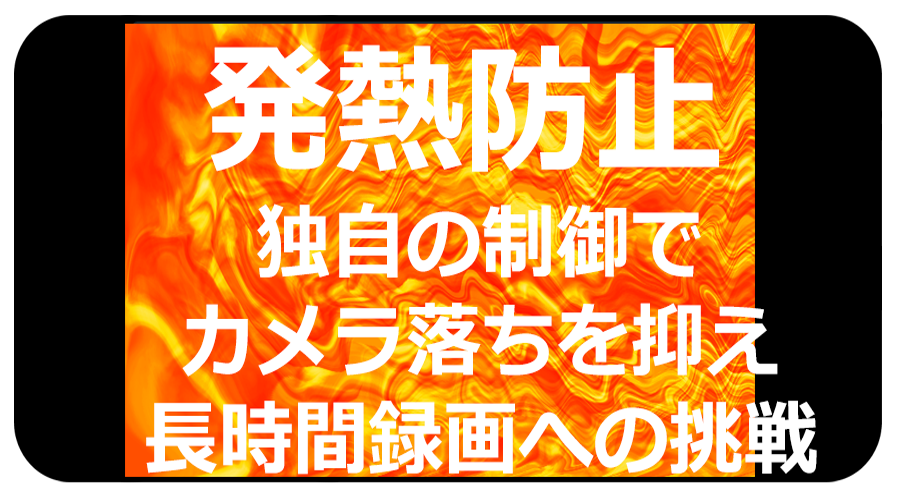 アプリ起動後に「設定」を行えば、高画質長時間録画で発生するカメラ落ちの原因となるスマートフォンの発熱を極力抑えることが出来ます。映像と音声を別々に記録し録画終了後に自動でミックス(多重化)すれば発熱を極力抑えることが出来ます