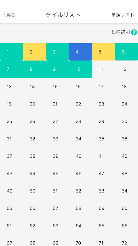 おぼえた単語に応じて色づくタイルリストをご用意。すべてのタイルが緑になると...