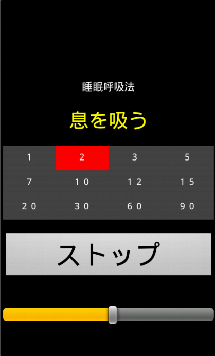 ・「息を吸う」(約4秒)⇒「息を止める」(約7秒)⇒「息を吐く」(約8秒)を指定された分間だけ繰返します。