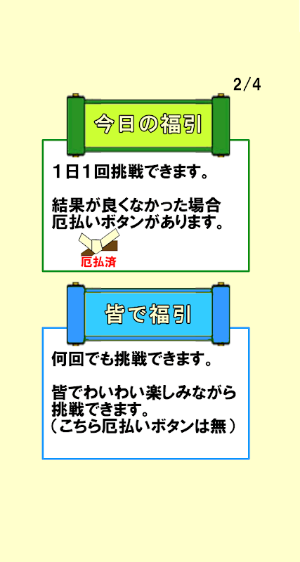 1日1回挑戦できる福引おみくじです。2回目以降は同じ結果になります。翌日になると新しいおみくじに挑戦できます。くじの結果が悪かった場合、厄払い動画で厄払いできます。