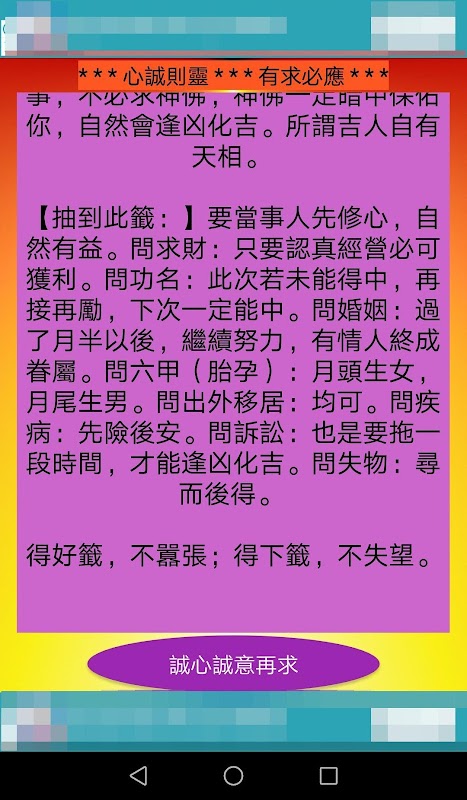 如果你心神恍惚,遇到事情時六神無主,無法好好判斷和下決定,不妨用手機求籤,問問前程,只要心誠則靈,而且有求必應,趨吉避凶。