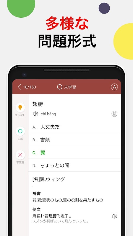 Las preguntas como el tipo de selección y el tipo de prueba se dan de acuerdo con la situación de aprendizaje del chino. ¡Fácil aprendizaje con solo tocar "Entiendo" o "No sé"!