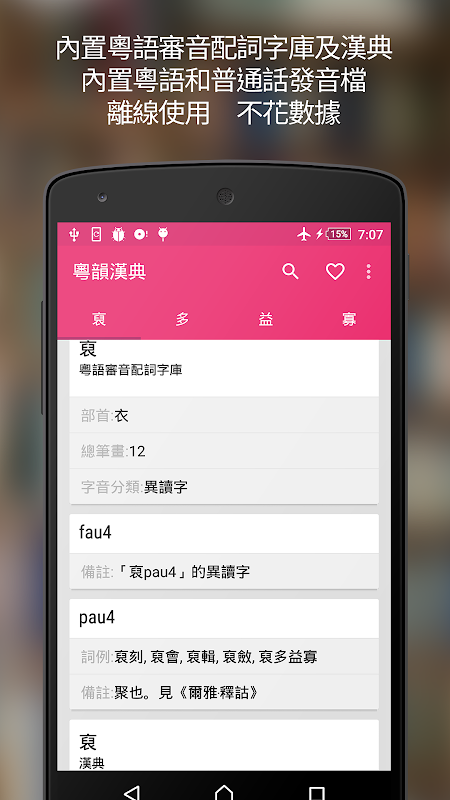 - 內置字庫和發音檔,讓你離線查閱粵語審音配詞字庫、漢典