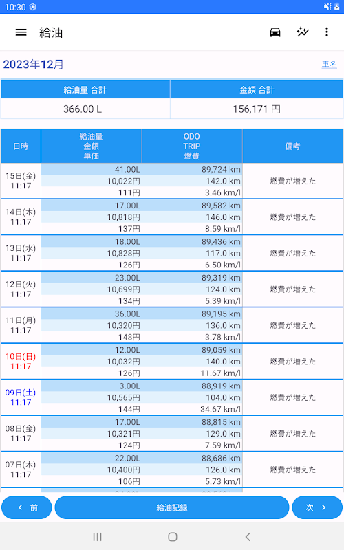 Es una aplicación para registrar la cantidad de repostaje / cantidad / precio unitario, etc. Si ingresa el kilometraje acumulativo ODO/kilometraje VIAJE, el consumo de combustible se calculará automáticamente.