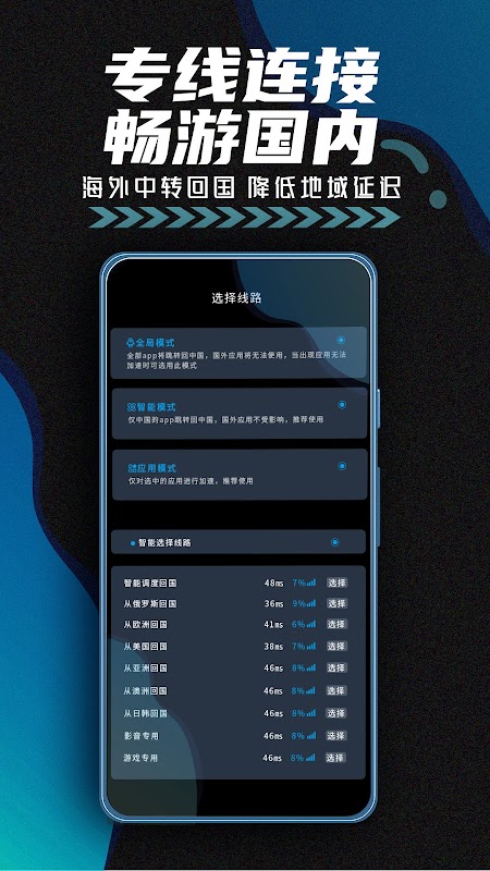 "Aiguo Returning to China Accelerator" ayuda a los estudiantes chinos en el extranjero a acceder rápidamente a la red nacional, elimina las restricciones geográficas en el extranjero y desaparecen todos los problemas de derechos de autor; es compatible con todo el software principal en China y satisface a las partes en el extranjero escuchando canciones, persiguiendo dramas, viendo programas de fanáticos , cómics nacionales y juegos de servidores nacionales, sociales, de oficina y otros escenarios, ayudando a un solo clic a regresar al país para reducir los retrasos en la red.