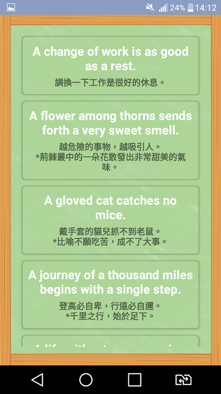 Operación simple, 14 tipos de proverbios clasificados, modismos de cuatro caracteres chinos correspondientes, aprendizaje contrastado de chino e inglés. Un buen ayudante para aprender inglés y un buen ayudante para la composición en inglés.
