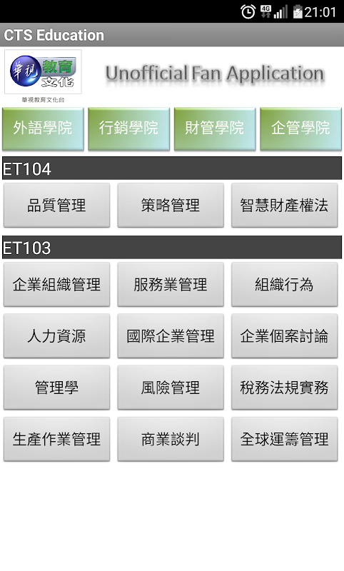 一個喜歡華視教育台的人,將華視教育頻道免費資源整合的應用程式。內容初分為外語學院、行銷學院、財管學院、企管學院。