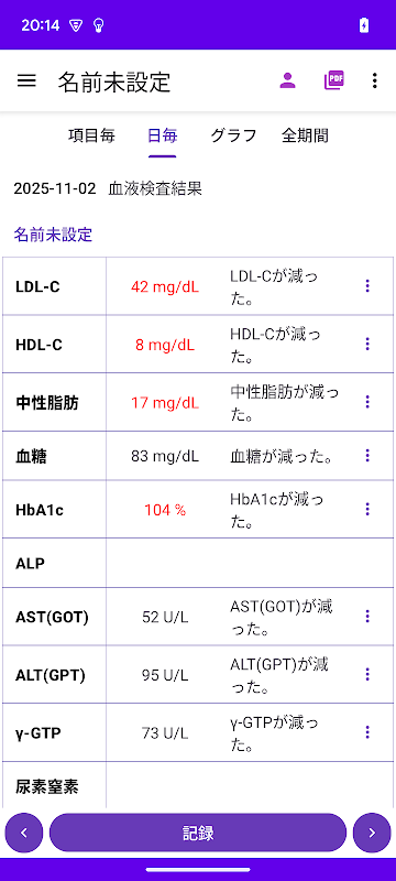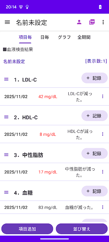 Toque el gráfico superior para mostrar un gráfico de líneas de resultados de análisis de sangre para cada registro.