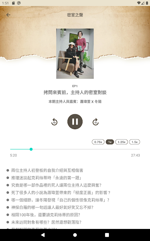 Además de los libros electrónicos, también está el programa temático guiado por celebridades "La Voz de la Cámara de los Secretos", producido por primera vez para la reina asesina. Es copresentado por Dong Yang, presidente de la Asociación de Escritores de Misterio de Taiwán. , y el novelista policiaco taiwanés Xiao Weixuan, que invitan a los entusiastas del razonamiento de diferentes campos, se adentran en la habitación secreta de la reina asesina y siguen el sonido para explorar los diversos acertijos, trucos y trampas establecidos por Christie en el libro. ¿Quieres saber qué novela de Keigo Higashino rinde homenaje a Christy? ¿Quieres saber la verdad sobre la famosa "desaparición" de Christie? Desde los temas más introductorios hasta los más duros, todo en la "Voz de la Cámara de los Secretos".