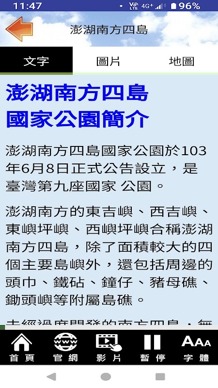 El Parque Nacional de las Cuatro Islas del Sur en Penghu se anunció oficialmente el 8 de junio de 2014. Es el noveno parque nacional de Taiwán, que incluye la isla Dongji, la isla Xiji, Dongyu Pingyu y Xiyu Pingyu, conocidos colectivamente como las Cuatro Islas del Sur y sus alrededores. islas y arrecifes afiliados. Esta aplicación móvil recopila información sobre la apertura de los parques nacionales y proporciona servicios de guías móviles como ecología natural, paisajes geológicos o sitios culturales e históricos para facilitar que los turistas experimenten el rico y diverso entorno ecológico de las cuatro islas del sur.