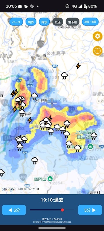 - Además de la información de precipitaciones, también puedes superponer información sobre la temperatura prevista, el pronóstico de rayos y la caída de rayos. También puedes visualizar el mapa topográfico de la Autoridad de Información Geoespacial de Japón.