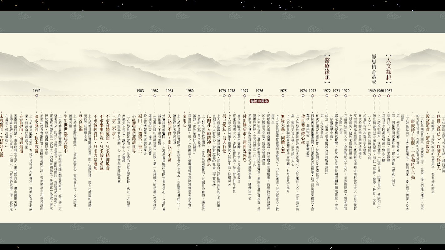 「靜思法脈慈濟宗門綱要」,是證嚴上人與靜思弟子,從初發心共同邁向慈濟第54年的艱辛歷程。每一則綱要都可開展出時代的脈絡,見證慈濟人入人群行菩薩道的心地風光。