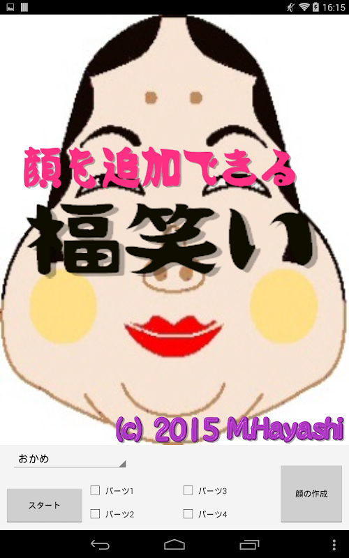 端末内の画像から顔を追加するには、[メニュー]の[画像ファイルから福笑い用顔の作成]をタップしてください。
