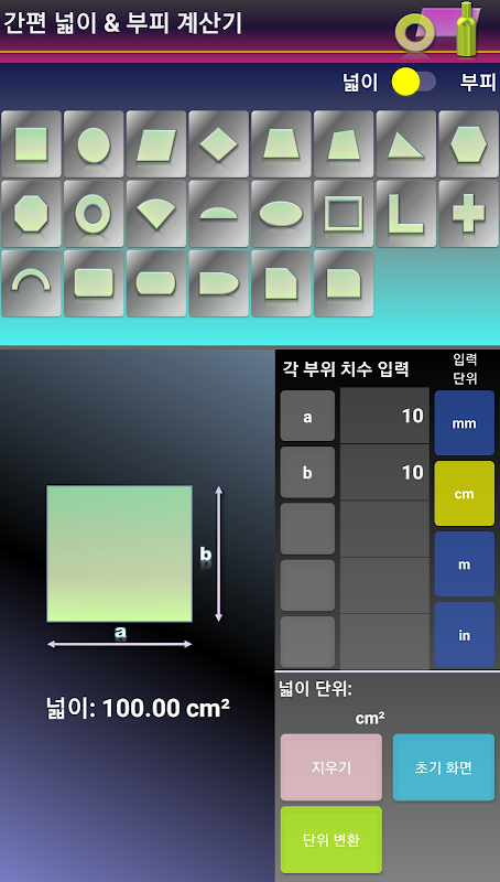 일반적으로 많이 사용되는 여러가지 모양의 면적과 부피를 쉽게 계산하기 위한 앱 입니다.