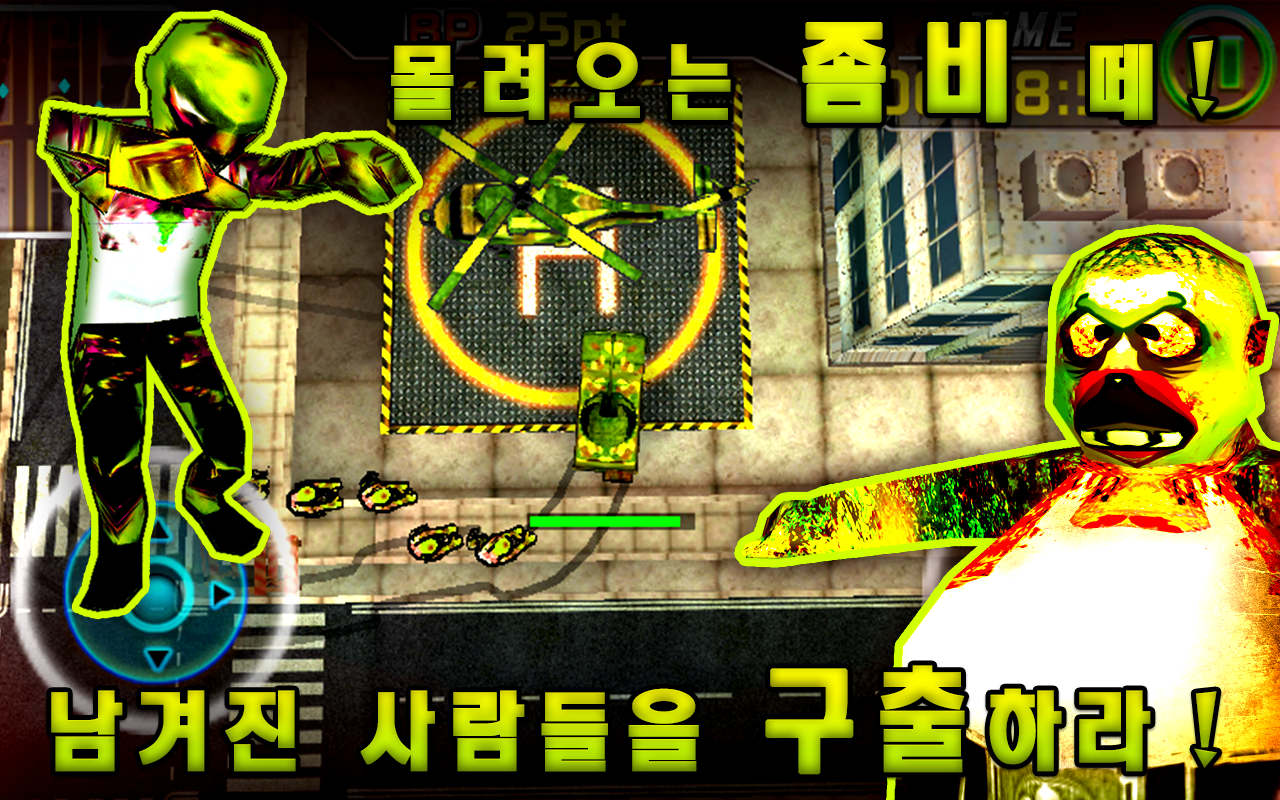 몰려오는 좀비 떼를 섬멸하고 제한 시간안에 주민들을 구출해서,