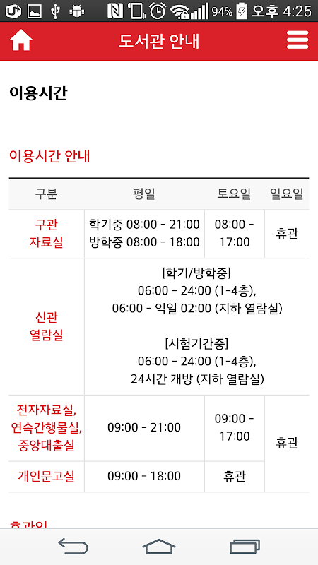 - 이용시간, 층별안내, 신관안내, 분관안내등의 정보를 제공합니다.