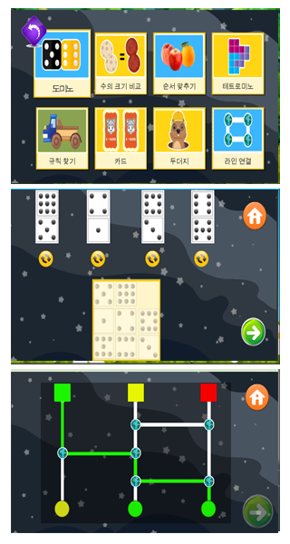 - 시청각 주의, 사고력, 수리력, 공간지각력, 기억력 영역의 게임.