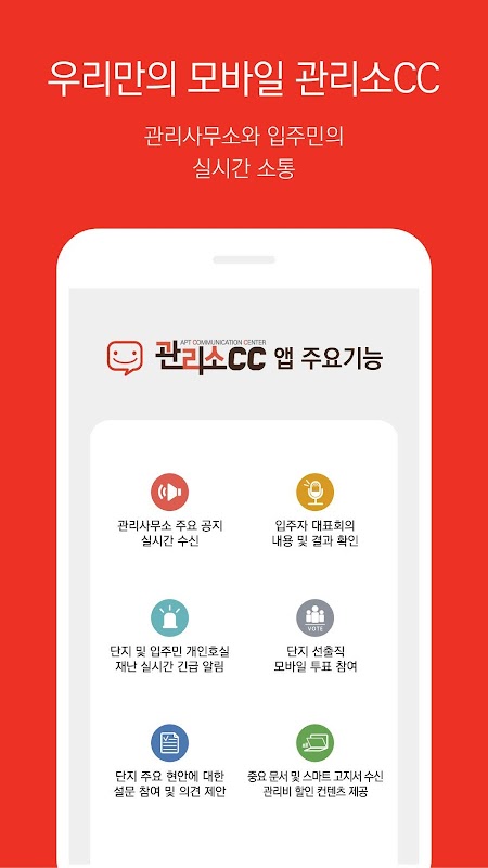 비용부담 없이, 사용 횟수 제한 없이, 관리사무소와 입주민 여러분의 커뮤니케이션을 지원하는 관리소CC는 입주민 여러분께서 더욱 편리한 생활을 누릴 수 있도록 도와드리는 앱입니다.