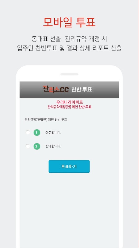 동대표 선출, 관리규약 개정 시 입주민 찬반투표 및 결과 상세 리포트 산출