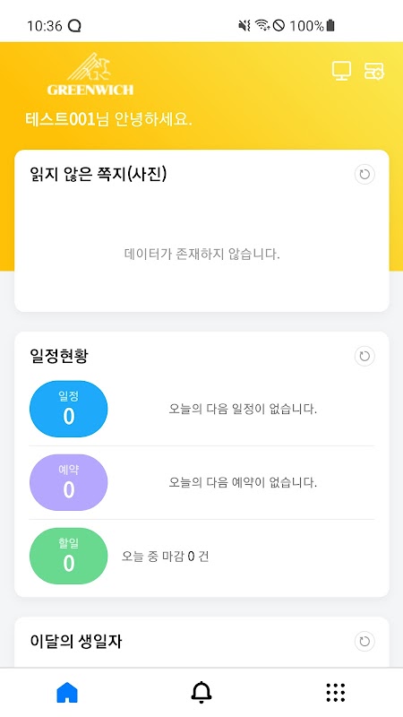 - 그리니치 전용 모바일 플랫폼은 그리니치 임직원이 함께 이용하기 위한 유무선 통합 업무환경을 제공하는 플랫폼입니다.