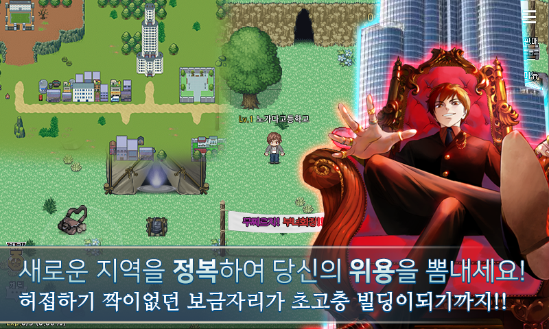 노가다고등학교의 세계에는 침흘리는 푸들, 빤스맨, 무개념 캣맘 등등 선량한 시민들에게 민폐를 끼치는 강력한 빌런들이 존재합니다. 자동사냥버튼을 눌러 그들에게 치명적인 공격을 가하여 갱생시키세요!! 빌런들이 마음을 고쳐먹고 선량한 시민으로 되돌아 갈수있도록 당신의 빳다질로 도와주세요!