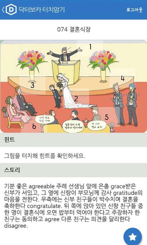 그림 위 번호를 터치하면 해당되는 영어단어, 뜻, 힌트, 스토리를 확인할 수 있습니다.