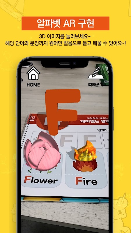 Al aprender el primer idioma de su hijo, Round Alphabet Coloring Book (con AR) es una aplicación de libro de texto de aprendizaje de AR que combina libros para colorear y educación. Esta aplicación hace que el proceso de aprender el alfabeto sea más interesante y divertido para los niños. Además de simplemente aprender las letras del alfabeto, puedes hacer clic en la imagen 3D correspondiente a la letra para escuchar las palabras y oraciones en inglés correspondientes con la pronunciación de un hablante nativo. También es una aplicación de libro de texto de aprendizaje AR en la que aprendes escribiendo letras en el orden correcto y divirtiéndote mientras juegas. Lindas imágenes que a los niños les encantan se mueven tridimensionalmente y vívidamente en el libro, lo que despierta la curiosidad de los niños.