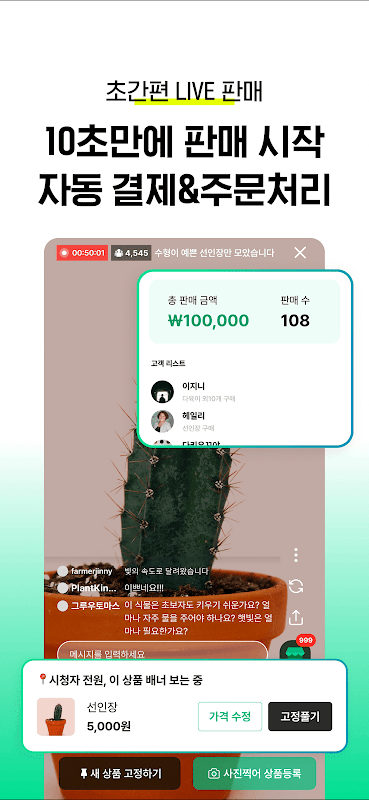 ¡La tarifa de ventas en vivo es de 0 wones! Puede registrar productos muy fácilmente y abrir un mercado en vivo donde puede comunicarse con los clientes en tiempo real.